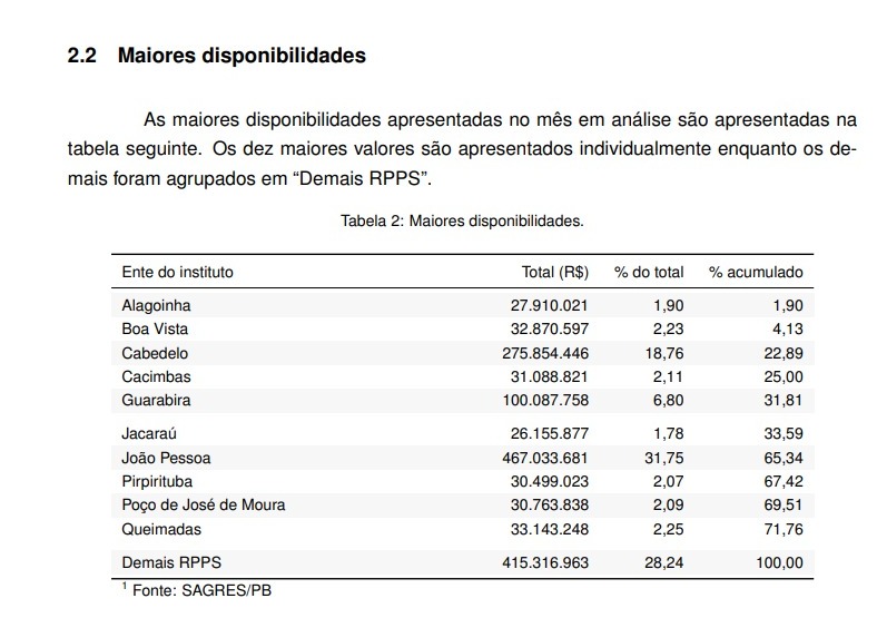 O município de João Pessoa, que tem uma folha de aposentadorias e pensões, proporcionalmente maior, acumula recursos na ordem de R$ 467,3 milhões, seguido de Cabedelo com R$ 275,8 milhões e Guarabira, que passa dos R$ 100 milhões em caixa pagar os inativos. Os demais, acima dos R$ 26 milhões, estão, pela ordem, Queimadas (R$ 33.143.248), Boa Vista (R$ 32.870.597), Cacimbas (R$ 31.088.821), Poço de José de Moura (R$ 30.763.838), Pirpirituba (R$ 30.499.023), Alagoinha (R$ 27.910.021) e Jacaraú (R$ 26.155.877).