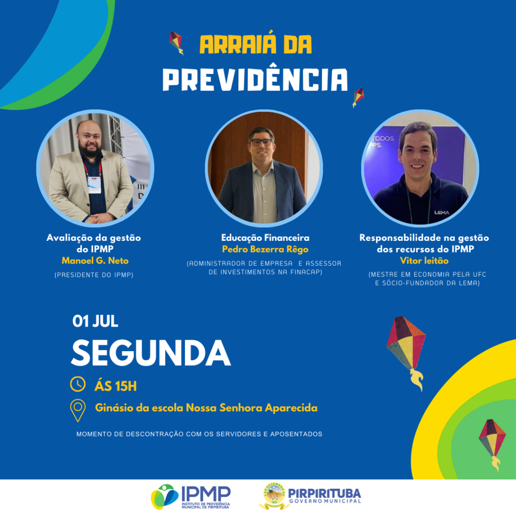 No próximo dia 01 de Julho acontecerá o “Arraiá da Previdência” com a presença de Pedro Bezerra Rêgo, Vitor Leitão e Manoel G. Neto. Iremos falar sobre educação financeira, responsabilidade na gestão dos recursos do IPMP, além de um momento de descontração com forró para os servidores e aposentados.