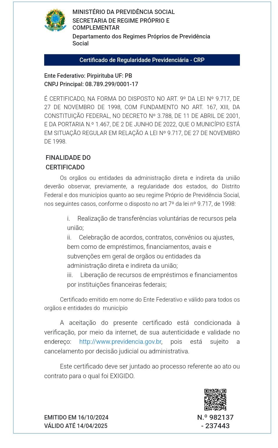 Pelo oitavo ano consecutivo o Instituto de Previdência do Município de Pirpirituba emitiu seu Certificado de Regularidade Previdenciária (CRP), funcionando como uma espécie de selo de qualidade emitido pelo Ministério da Previdência Social e atestando o cumprimento dos critérios fiscais e administrativos, determinados pela Secretaria de Políticas de Previdência Social (SPS)