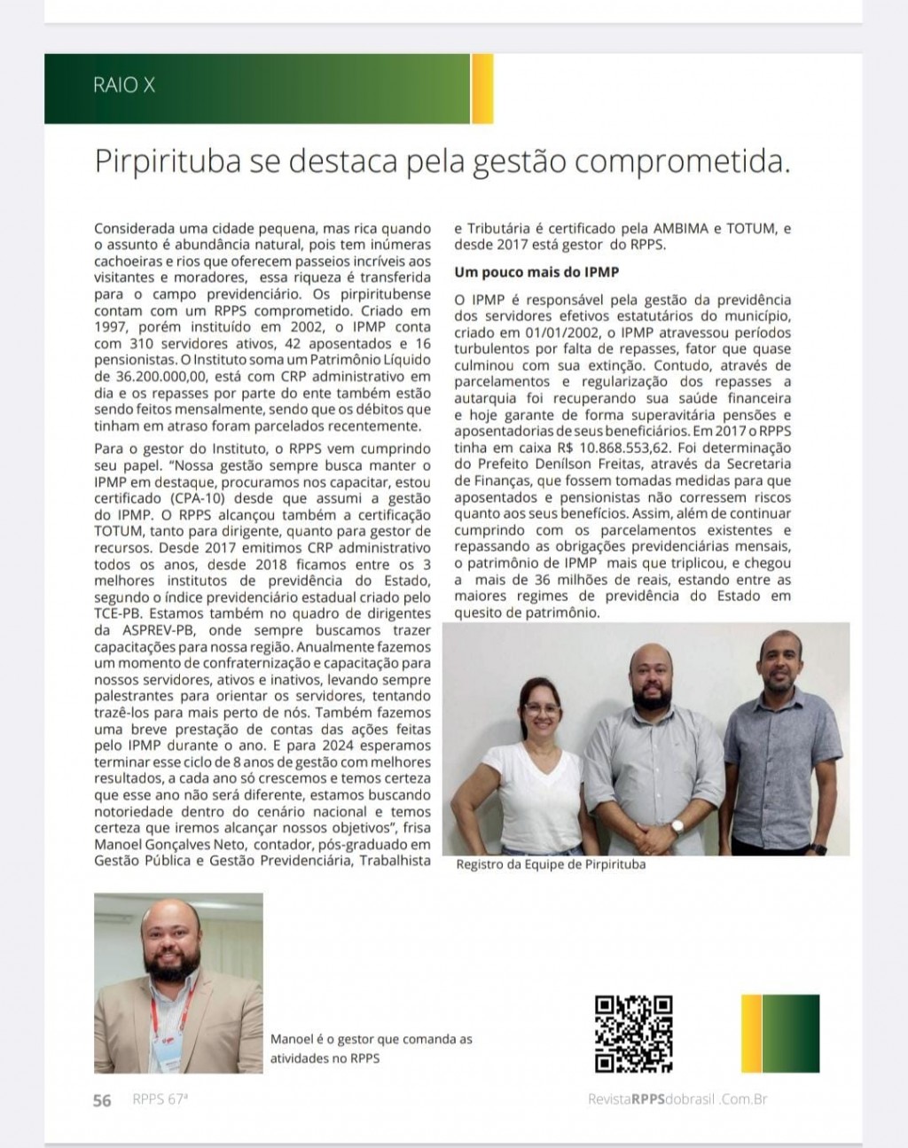 A cidade Paraibana de Pirpirituba foi destaque na edição n°67 da Revista RPPS Brasil especializada em gestão previdenciária. O destaque se dá pela forma como o Instituto de Previdência do Município é gerida através de Manoel Neto que destaca sempre a importância da responsabilidade em gerir a coisa pública.O Instituto que está entre os melhores do estado viu seu patrimônio triplicar desde 2017 na gestão do atual Prefeito Denilson de Freitas (Didiu).